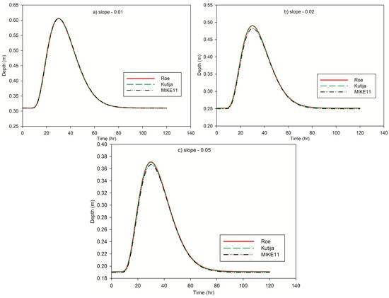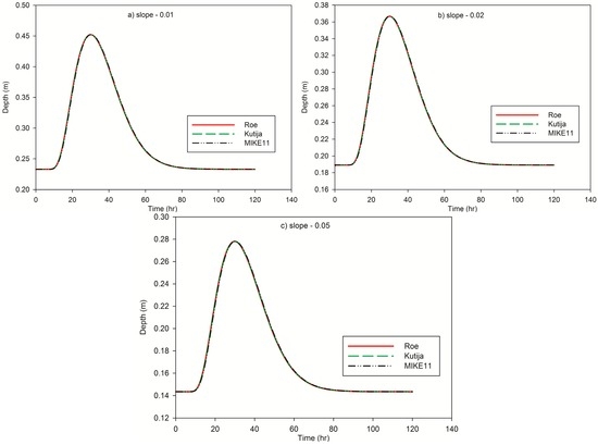 With more emphasis on flood depths, the depth outputs of the simulations are used as a means of comparison. The simulation results of the three methods at the centre of the channel (2500 m) are shown in Figure 3 by graphical representation of water depths as a function of time. The first model run was for a channel of bed slope . In that test, the Froude number varied from 0.71 to 0.79; hence a subcritical flow condition was observed. The second and third model runs were for slopes of and with Froude numbers of 0.97–1.08 and 1.47–1.63, respectively; hence supercritical flows. As shown in Figure 3, at = 2500 m, the water depths computed by the Kutija method and MIKE11 are the same as those of the Roe scheme for all slopes. Therefore, in this case, the SWEs with partially or totally reduced momentum equations computed the same result as the full SWEs in simulating supercritical flows. Moreover, Figure 3 demonstrates that the time to peak depth is the same in all the three methods. This depicts that there was no phase error by the methods that reduced the convective acceleration term partially or completely in case of supercritical flows.