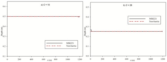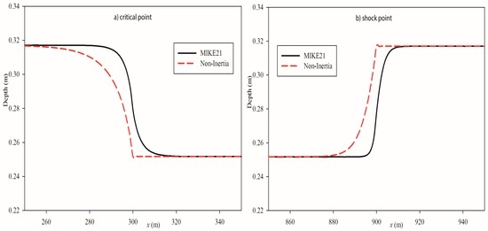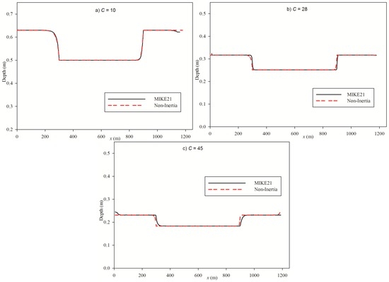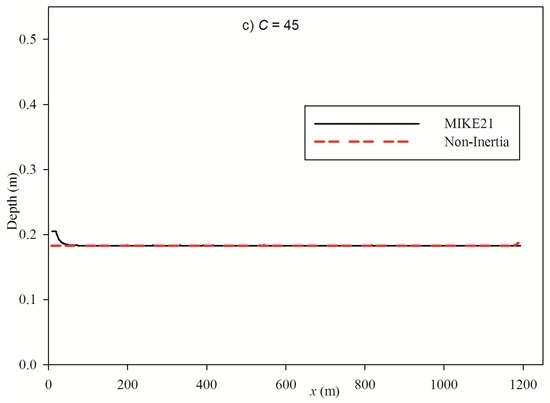 Simulation results of MIKE21 and non-inertia model setups show that even in supercritical flow conditions, the two models registered quite similar flow depths (Figure 7b,c). The upstream and downstream depth results show disagreement and that is due to the boundary condition implementations of the two modelling software.
