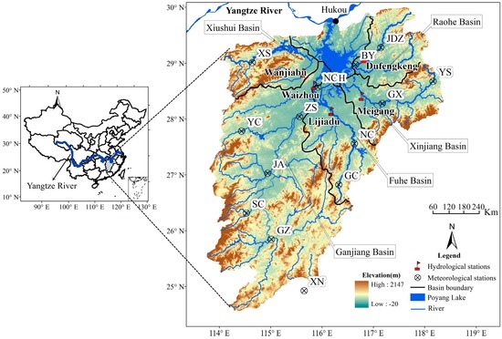 Location of the Poyang Lake Basin and the distribution of hydrological stations and meteorological stations (XS: Xiushui; JDZ: Jingdezhen; BY: Boyang; NCH: Nanchang; ZS: Zhangshu; YS: Yushan; GX: Guixi; NC: Nancheng; YC: Yichun; JA: Jian; GC: Guangchang; SC: Suichuan; GZ: Ganzhou; XN: Xunniao).