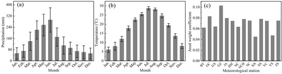 Mean monthly precipitation (a); and temperature (b); and the areal weight coefficients from Thiessen method for the 14 meteorological stations (c) in the Poyang Lake Basin from 1961 to 2012.