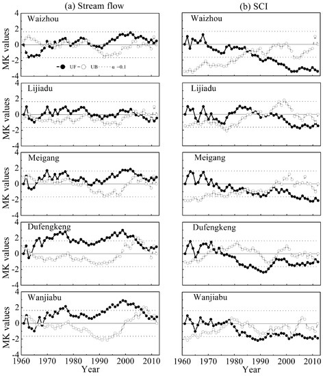 With regard to the inter-annual variability of SCI (Figure 3b), SCI was in a decreasing trend after 1970 at Waizhou station and the trend reached 0.1 significance levels after 1990. Changes of SCI at Lijiadu station experienced an undulate stage (1961–1969), an increased stage (1978–1990), and two decreased stages (1969–1977 and 1990–2012). Change patterns of SCI at Meigang and Dufengkeng stations were similar, which can be divided into two stages (i.e., an increased stage before 1970s and a decreased stage thereafter). At Wanjiabu station, SCI fluctuated before 1979 but decreased sharply afterwards. The decreasing trend was significant after 1986. Specific intersections of UF and UB were found in 1984 for Waizhou station, and 1978 for Wanjiabu station, implying that the years might be the change points.