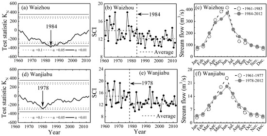For SCI series, significant decreasing trends were observed at Waizhou, Meigang, and Wanjiabu stations (Table 3) with a Kendall trend of −0.53, −0.49, and −0.28 decade−1, respectively. Change points were identified to be 1984 for SCI at Waizhou station and 1978 at Wanjiabu station (Figure 4a,d). The average value of SCI at Waizhou station shifted downward from 14.0 during 1961–1983 to 12.1 during 1984–2012 (Figure 4b). At Wanjiabu station, SCI shifted downward from 15.0 during 1961–1983 to 12.3 during 1984–2012 (Figure 4e). The amount of stream flow after the change point was lower than that before the change point in May and June (major flood period of the Poyang Lake Basin), which indicated that the stream flow became uniform after the change point (Figure 4c,f).