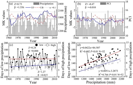 Annual PCI for the whole study area showed no significant temporal trends, with an average value of 13.3 from 1961 to 2012 (Figure 5b). The result indicates seasonal precipitation patterns. The distribution pattern of PCI was more complex than that of precipitation. PCI was relatively low in western and eastern parts and high in the central part of the Poyang Lake Basin (Figure 6c). There was also no significant trend and change point detected in the series of the PCI (Figure 6d).