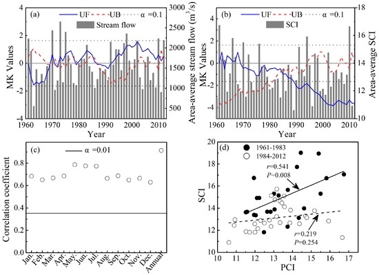 MK values of the: annual stream flow (a); and SCI (b) for the Poyang Lake Basin from 1961 to 2012.
