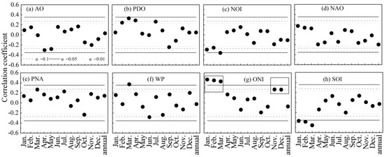 Pearson’s correlations between stream flow and atmospheric circulation index (AO, Arctic Oscillation (a); PDO, Pacific Decadal Oscillation (b); NOI, Northern Oscillation Index (c); NAO, North Atlantic Oscillation (d); PNA, Pacific North American Index (e); WP, Western Pacific Index (f); ONI, Oceanic Nino Index (g); SOI, Southern Oscillation Index (h)).