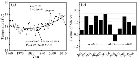 Temperature change (a); and the trend of monthly temperature (b) in the Poyang Lake Basin from 1961 to 2012 (*** significant at P ≤ 0.01).