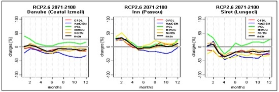Uncertainties related to the choice of GCM in the projections of changes in the seasonal regime into the far future (2071–2100) in relation to the recent runoff regime (1971–2000) for three selected stations in the Danube catchment: the Danube River at the entrance to its delta (Ceatal Izmail station), the Upper Danubian tributary Inn (Passau station), and the Lower Danubian tributary Siret (Lungoci station).