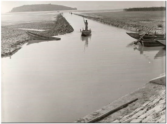 Lake Trasimeno is a shallow lake of orogenic origin, dating back one million and seven hundred years. Its origin is mainly alluvial and tectonic because of the crustal movements that occurred during the mid-Quaternary period, involving the western side of Umbria. Many researchers have supposed that crustal movements brought about the separation of Val di Chiana from the nearby depression occupied by the lake [1]. This can also be observed from Leonardo’s famous map [2], now in the Royal Library of Windsor, which shows this area around the year 1500. In the last century, the lowest level of the lake was 254.69 m above sea level (m a.s.l.) in October 1958 (Figure 1). Then, the natural catchment basin was enlarged in years 1960–1962, allowing the lake to rapidly recover from drought.