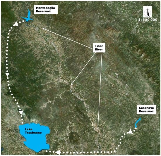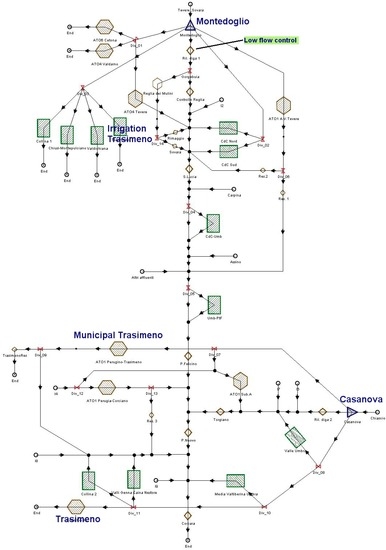 The proposed sketch of the hydraulic network refers to the entire system of the Tiber River, with its Montedoglio reservoir and the Chiascio River with the Casanova reservoir (Figure 3).