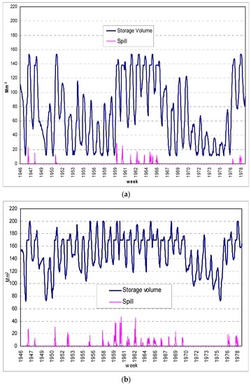 (a) Montedoglio Reservoir, volume stored and spills; (b) Casanova Reservoir, volume stored and spills.