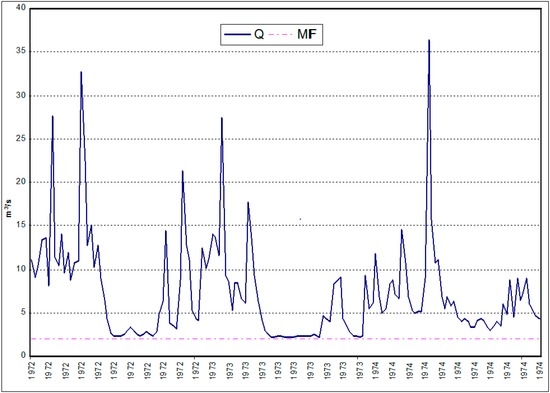Together with estimating of the availability of water for Lake Trasimeno, it is necessary to evaluate the effects that these releases can have on the lake itself. Therefore, a balance equation for the inflows and outflows of the lake has been introduced, which can been applied to the available time series of the lake levels. In this case the time step is monthly, because the variations in the level are very slow and the evaporation data can be estimated better in terms of monthly data [38]. The link with the SimBaT model output is not a problem, because the monthly volume is the sum of the corresponding weekly volumes, or, in the other direction, the weekly volume can be considered a uniform distribution of the monthly volume.