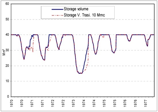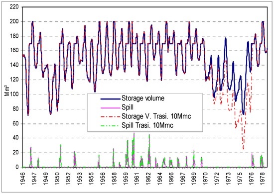 This new volume was distributed over 12 weeks in the period January–March, so as not to overlap with the drier months of the year and with greater water demand. In Figure 7 it is possible to notice how, in the dry periods, the Casanova reservoir levels go down till a minimum of about 25 Mm3, but never reach the dead volume level (15 Mm3). This situation does not generate deficit problems for the other water uses.