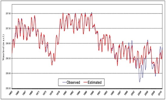 The monthly lake levels were calibrated with good accuracy (1963–1999) using Equation (3). The mean error was 1.3%, and only in 3% of cases did the error exceeded 5%, as can also be seen in Figure 9, where observed and estimated water levels are compared. The mean error is lower than the instrumental uncertainty associated with the measurements of the water level. In the validation period (2000–2010), the estimates closely match the observed data, except in the years 2002–2005. This may be due to two specific anomalous weather events: the very dry summer of 2002 and flood events in November–December 2005. During these events, the calibrated average runoff coefficients were inadequate to quantify the water inflow from the watershed. However, the effect of these anomalies turned out to be compensated for at the end of the validation period (2006–2010), thus supporting the reliability of the model in long-term simulations.