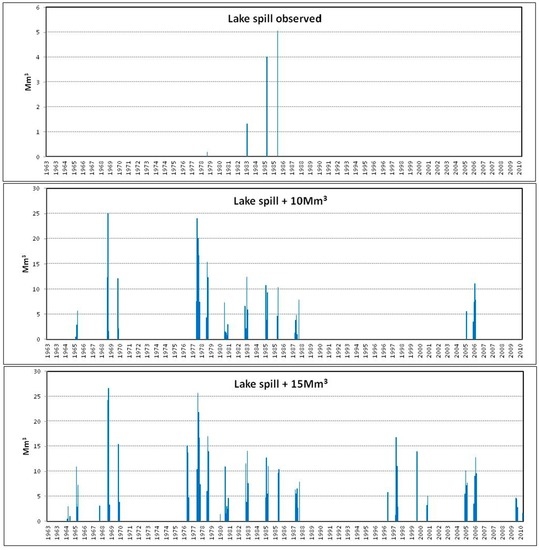 The effects of this hypothesis are pointed out in Figure 10, and they can be summarized in a different trend during dry periods with a reduction in the oscillation level range, and an increase in the minimum level of the lake estimated at about 90–110 cm at the end of the time series. These effects can also be translated in a marked increase of the operating period of the lake outlet (Figure 11), which brings a significant increase in water change and a possible better situation in quantitatively and qualitatively.
