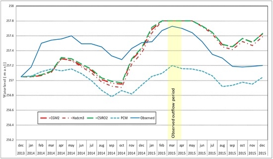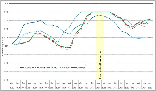 Taking into account the extreme emission scenarios (A1F1 fossil intensive growth, environmental sustainability B2), in Figure 12 and Figure 13 an initial comparison between the observed and simulated lake water levels for the test period (December 2013–August 2015) is shown. The set of CGMs evaluated are Hadcm3, PCM, CGM2 and CSIRO2.