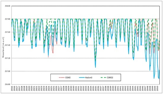 The importance of the results obtained in the previous sections is supported by the possible future effects of climate change on Lake Trasimeno levels, in particular due to a temperature increasing trend. Previous studies provide a framework for future and more focused investigation [3,42,43]. In this section these assessments were conducted on the basis of climate change scenarios derived from different general circulation models (GCMs).