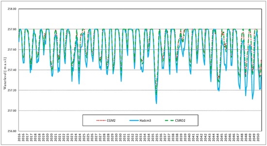 The predicted patterns of water level changes are shown in Figure 14 and Figure 15. All scenarios show that the water level is expected to fluctuate within the range of the previous years. Only at the end of the simulation period does the trend show a critical condition, more evident in the emission scenario A1F1.
