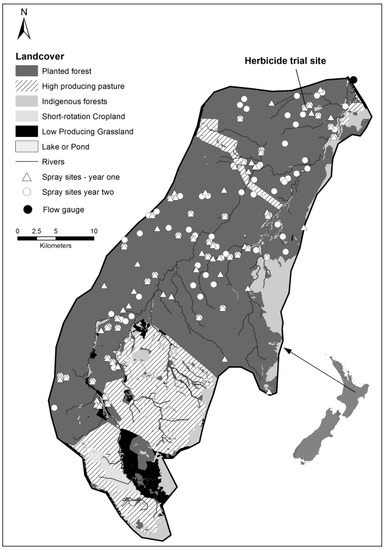 Maximum temperatures average 24 °C in February and 14 °C in August at Murupara. Low temperatures are typically 16 °C in February and 7 °C in August [49]. Average temperatures during the herbicide application months of September through January range from 8.4 °C in September to 16.3 °C, increasing by 1.5 to 4.0 °C per month. Planted forests, predominantly Pinus radiata, dominate land cover in the upper Rangitaiki River catchment (Figure 1), (71% of the land cover). High and low producing pasture as well as cropland occupy the upper 21% of the catchment. Indigenous forest is present in patches along the eastern margin (8% of land cover).