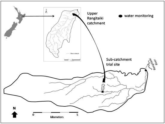 Location of herbicide trial in a sub-catchment of the upper Rangitaiki River catchment, New Zealand. Figure modified from [30].