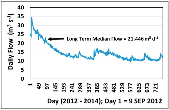 The Rangitaiki flow gauge is located at Murupara (Site No. BOP110015/RO3; Location: NZMG 2832905E). Drought conditions during the time period of the cumulative effects modeling (14 September 2012 to 15 July 2014), particularly during the summer of 2012–2013, affected flows (Figure 3). It was one of the most extreme droughts on record for New Zealand [50], and resulted in a median flow of 13.411 m3·s−1 during the study from 9 September 2012 to 15 July 2014. This median flow was considerably lower than the long-term median flow of 21.446 m3·s−1 (Figure 3).