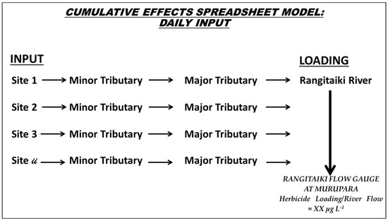 The cumulative effects model for the upper Rangitaiki River herbicide application analysis is an Excel [52] spreadsheet model developed by the authors. It involves routing streamflow from individual treated sites along tributary stream channels and into the main stem of the river down to the Rangitaiki flow gauge (Figure 4). Herbicide loading values and streamflow volumes at this site were then used to calculate concentrations for referencing with water quality standards. The modeling time period runs from 9 September 2012 to 4 September 2013 for Year 1 and 4 September 2013 to 7 September 2014 for Year 2.