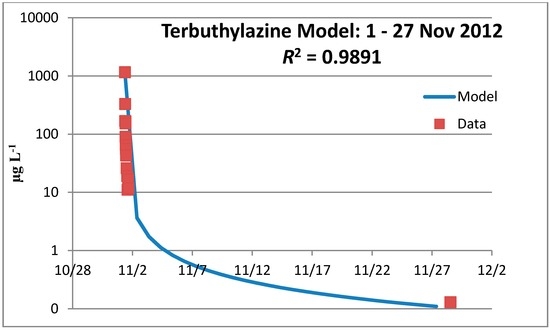 Streamflow terbuthylazine residue decay curve regression for Year 1 based on the data from the sub-catchment trial [30].