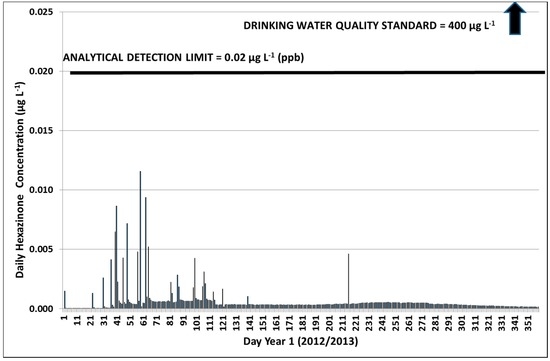 The daily average hexazinone residues in Year 1 modeled in the cumulative effects analysis for the upper Rangitaiki River are displayed in Figure 7. Although the model generated numerous peaks in hexazinone, none of them would be detectable in water samples. The detection limit with current technology is 0.020 μg·L−1 (solid line, Figure 7). The highest peaks in simulated residue flow occurred in late October and early November, 2012, when there was some time and space crowding and a large number of applications (20 of 64). The six-peak daily hexazinone concentrations over 0.005 μg·L−1 in the Rangitaiki cumulative effects analysis were at undetectable levels between 0.012 μg·L−1 (11 November 2012) and 0.005 μg·L−1 (9 and 17 November 2012). The single peak at Day 217 (17 April 2013; Figure 7) just over 0.004 μg·L−1 was due to the simulation of a one-day storm runoff pulse.
