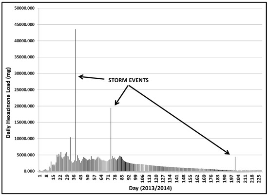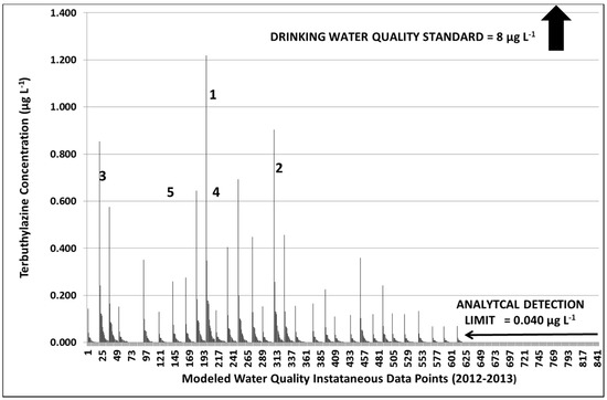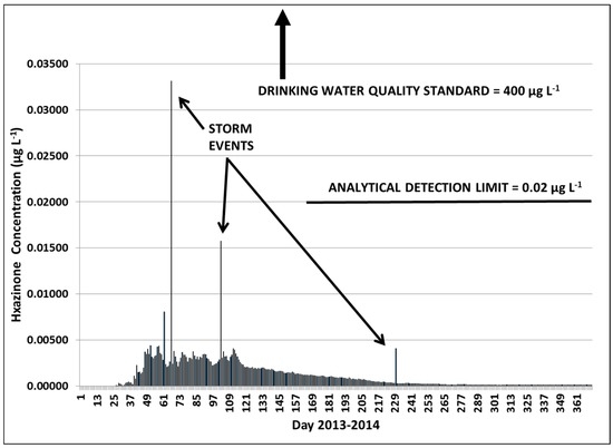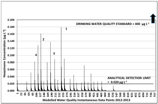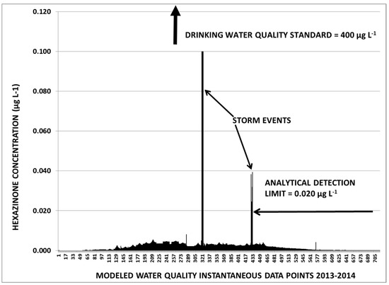 Instantaneous hexazinone peak concentrations above the detection level of 0.020 μg·L−1, were simulated to occur 38 times on 22 days between 15 September 2012 (Day 2) and 19 December 2013 (Day 463, Figure 8). Peaks 1–3 lasted 98 min with four successive samples containing hexazinone residues that would be detectable. Peak number 4 was characterized by detectable residues that persisted for 83 min (Figure 8). Most of the other peaks above the hexazinone detection level persisted for only 15 min in the simulation. For peak number 1 on 15 November (Day 63), the simulated maximum hexazinone concentration was 0.179 μg·L−1 that declined rapidly to <0.067μg·L−1 over the next 45 min. Instantaneous peak concentrations on Day 41 (24 October 2012), Day 49 (1 November 2012), and Day 40 (23 October 2012) were 0.161, 0.138, and 0.128 μg·L−1, respectively (Points 2–4, Figure 8). All other detectable peaks (21) were simulated to be less than 0.10 μg·L−1.