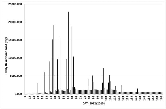 Hexazinone daily mass loadings in the Rangitaiki River in Year 1 at the flow gauging station are shown in Figure 9. The peak daily loading was 22,868 mg on Day 59 (11 November 2012) after nine sites were treated in 14 days, including the reference catchment. Of the 3601 kg of hexazinone applied to the treated areas, the cumulative amount of hexazinone in streamflow for the entire Upper Rangitaiki Basin, as simulated at the Rangitaiki flow gauge, was 0.366 kg, or 0.010% of the applied chemical.