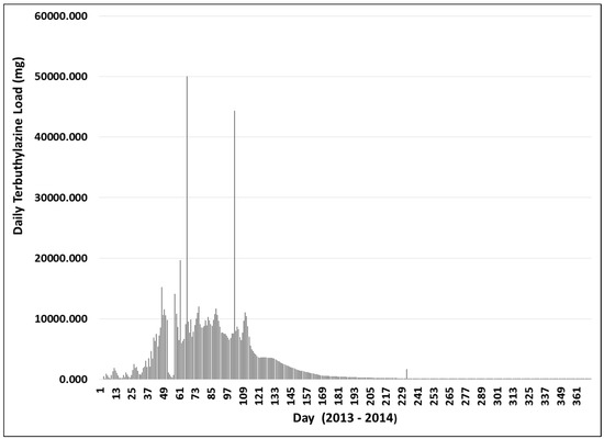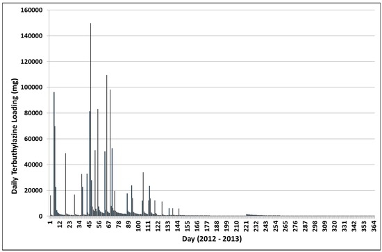 Studies of river water and pond water have indicated variable half-lives ranging from >1 year to 3 months to >1 month. Other studies have found that, for very high sunlight intensities (full midday sunlight), the terbuthylazine half-life was 39 h [61,62]. These degradation processes were not considered in the cumulative effects analysis since no local data were available to corroborate results of other studies for the Rangitaiki River. The authors acknowledge that degradation processes would have influenced these results to a limited extent.