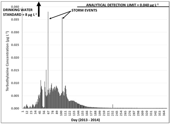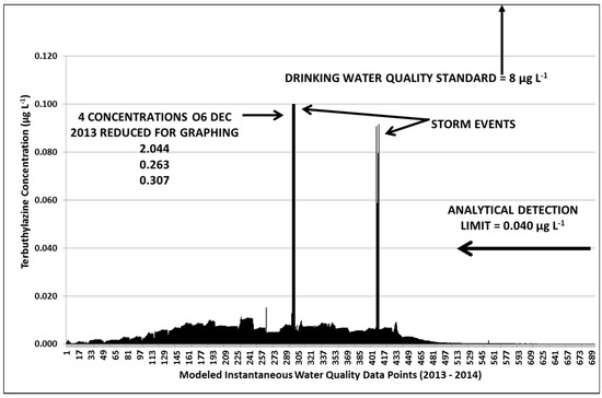 None of the modeled daily average or instantaneous terbuthylazine peak concentrations in either Year 1 or Year 2 was of any toxicological significance (Table 5). The safety factors in Year 1 were large, ranging from >25,986 for human Acceptable Daily Intake of 4 L·day−1 to >362,510 for Daphnia spp. LC50. The rainbow trout LC50 safety factors were all in excess of 3117. The lowest safety factor for the NZ drinking water standard (same as the World Health Organization standard for terbuthylazine [63]) was 7, based on simulated instantaneous concentrations (Figure 14) and >119 for the daily average concentration(Figure 13). The other low safety factor (104) was based on improbable ingestion of 1.0 m3·day−1 of water.