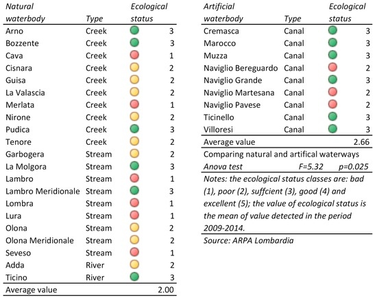 In this context, the monitoring and control of the ecological and chemical status of waterways by ARPA provides some critical considerations concerning the quality of water. Data (see Figure 1) provided by detection stations in 2014 (the last available value by ARPA) [28] highlight the overall value of surface water quality in the area as being very low (2.2). However, canal water is, on average, significantly (Anova test: p-value = 0.025) better than stream water (2.66 vs. 2.00).