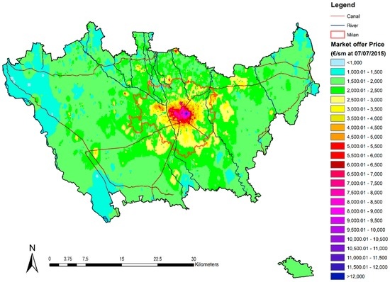 Based on this last information, each residential unit was geo-referenced by means of a software called “Google Earth Pro 7.1.5®” (Mountain View, CA, USA). The database was reduced to approximately 27,000 data points because of a lack of address information or of errors invalidating the geo-referencing process. The coordinates make it possible to map the properties for sale on the map and to use GIS (The GIS software used is Arcgis 10.2.2®, Redlands, CA, USA) software for computing spatial variables (the function Near in the Analysis Tools of Arcgis is used to calculate the shortest distance, i.e., “as the crow flies”, between the point relative to each individual property and the nearest point of the resource or of the territorial component being analyzed), such as distance from the city center, subway and rail stations, malls and water bodies.