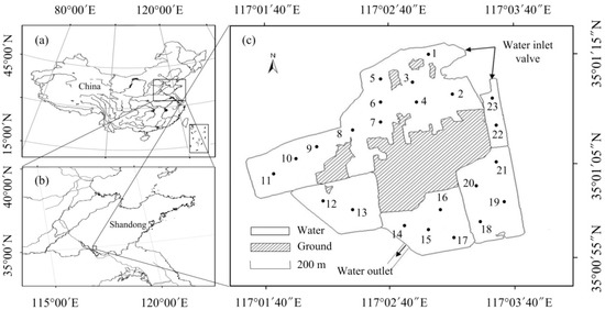 Location of Lake Qixinghu in (a) China; and (b) Shandong Province; and (c) the sample sites in the lake.