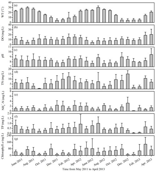 Combined variations of (a) water temperature (WT); (b) dissolved oxygen (DO); (c) pH; (d) total nitrogen (TN); (e) ammonia nitrogen (NH4+-N); (f) total phosphorus (TP); and (g) chlorophyll a in different months in Lake Qixinghu. The environmental factors in each month are expressed as mean values and standard deviations of the 23 sample sites in the lake.