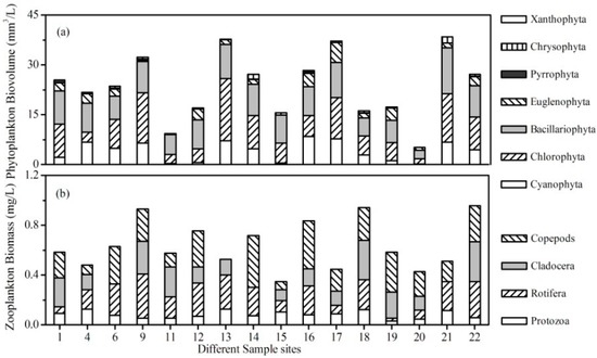 (a) The biovolume of phytoplankton and; (b) the biomasses of zooplankton in different sites of Lake Qixinghu.