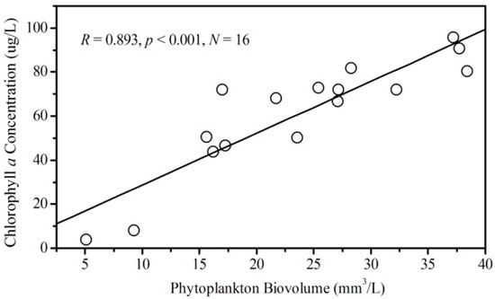 A total of 71 phytoplankton species belonging to 45 genera and 7 phyla were identified in the lake. The phytoplankton community included 28 Chlorophyta species, 19 Bacillariophyta species and 12 Cyanophyta species. Phytoplankton biovolume in different sites ranged from 5.10 mm3/L to 38.40 mm3/L, with an average value of 23.70 mm3/L. The mean biovolume of Cyanophyta, Chlorophyta, and Bacillariophyta were 4.03 mm3/L, 8.39 mm3/L, and 8.46 mm3/L, which accounted for 17.01%, 35.39%, and 35.71% of the total phytoplankton biovolume, respectively (Figure 3a). The dominant taxa in the lake were Cyclotella (Bacillariophyta), Pandorina (Chlorophyta), and Phormidium (Cyanophyta). Chlorophyll a concentration was strongly correlated with phytoplankton biovolume (R = 0.893, p < 0.001, N = 16), as shown in Figure 4. Ratios between chlorophyll a and phytoplankton biovolume had no relationship with the biovolume proportions of Cyanophyta (R = −0.013, p = 0.962, N = 16), Chlorophyta (R = −0.078, p = 0.773, N = 16), and Bacillariophyta (R = −0.081, p = 0.766, N = 16) in these sites. Secchi depths of the 16 sites varied from 0.95 m to 1.25 m. Secchi depth had no significant influence on the ratios between chlorophyll a and phytoplankton biovolume (R = 0.131, p = 0.628, N = 16).