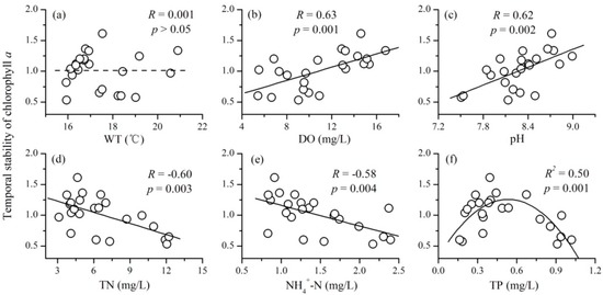 The relationships between the mean values of (a) water temperature (WT); (b) dissolved oxygen (DO); (c) pH; (d) total nitrogen (TN); (e) ammonia nitrogen (NH4+-N); (f) total phosphorus (TP) and the temporal stability of phytoplankton biomass (chlorophyll a) in Lake Qixinghu. The fitting of regression equations is calculated using the 23 sample sites in the lake (all N = 23).