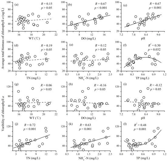 The relationships between the mean values of (a) water temperature (WT); (b) dissolved oxygen (DO); (c) pH; (d) total nitrogen (TN); (e) ammonia nitrogen (NH4+-N); (f) total phosphorus (TP) and the average total biomass of phytoplankton. Figures (g–l) are the relationships between the mean values of the six environmental factors and the variability of phytoplankton biomass (chlorophyll a) in the lake. The fitting of regression equations is calculated using the 23 sample sites in the lake (all N = 23).