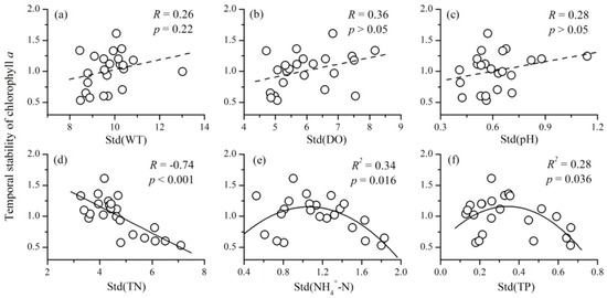 The relationships between the variability of (a) water temperature (WT); (b) dissolved oxygen (DO); (c) pH; (d) total nitrogen (TN); (e) ammonia nitrogen (NH4+-N); (f) total phosphorus (TP) and the temporal stability of phytoplankton biomass (chlorophyll a) in Lake Qixinghu. Std: standard deviation. The fitting of regression equations is calculated using the 23 sample sites in the lake (all N = 23).
