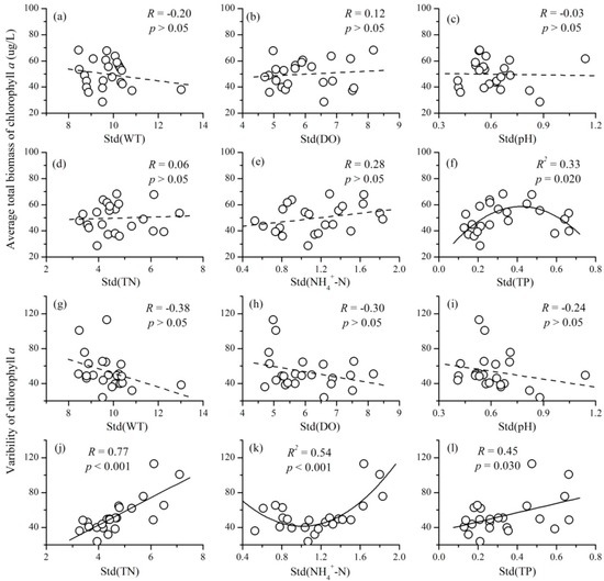 The relationships between the variability of (a) water temperature (WT); (b) dissolved oxygen (DO); (c) pH; (d) total nitrogen (TN); (e) ammonia nitrogen (NH4+-N); (f) total phosphorus (TP) and the average total biomass of phytoplankton. Figures (g–l) are the relationships between the variability of the six environmental factors and the variability of phytoplankton biomass (chlorophyll a) in the lake. The fitting of regression equations is calculated using the 23 sample sites in the lake (all N = 23).