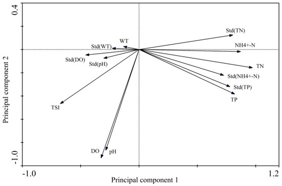 The PCA revealed that the first and second principal components explained 56.0% (eigenvalues = 0.560) and 22.7% (eigenvalues = 0.227), respectively, of the variance for all the variables. Phytoplankton TSI was positively correlated with both DO and pH (Figure 9), which was consistent with the relationships in Figure 5. The mean values of DO and pH in the lake were highly correlated with each other (Figure 9). However, phytoplankton TSI was negatively correlated with all the nutrients (TN, TP, and NH4+-N) and their variability in the lake (Figure 9). Some of the nutrients were highly correlated with each other, e.g., TN and NH4+-N, TN, and TP (Figure 9). In summary, mean values of DO and pH had a positive influence on the stability of phytoplankton, while the effects of nutrients were always negative (Figure 9).