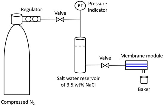 The liquid entry pressure (LEP) of alumina tube membranes were determined to study the wetting resistance. Figure 2 shows the lab-made setup [,]. A 200 mL stainless steel cylinder was used as the reservoir of salt water containing 3.5% NaCl. A pressure gauge was installed at the top of the cylinder. Before the measurement, the membrane module was prepared and the outlet of the feed side (lumen side) was sealed. Then, the inlet of the feed side was connected to the reservoir cylinder. During the test, hydraulic pressure was introduced from the compressed nitrogen, and increased with a step of 0.1 bar at an interval of 5 min. The test was run until a drop of water was observed on the shell side of the membrane. The pressure at which the water penetrated through the membrane was determined as the LEP of the membrane sample.