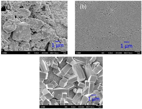 Figure 3a,b show the FESEM morphology of the inner and outer surfaces of the pristine alumina tube membrane. The inner surface morphology is highly organized and regular, while the outer surface appears to be very disorganized and amorphous. Hence, it may be achievable to grow even MOF coverage on the inner side. Figure 3c displays the inner surface morphology of the first growth tube membrane. Crystals with sizes of 1–3 μm are clearly observed on the membrane surface. The reaction between alumina membrane and 2-aminoterepthalic yielded blocks of NH2-MIL-53(Al) microcrystals under the hydrothermal condition. Under closer scrutiny in Figure 3c, these crystals are partially embedded in the membrane surface. This is because that the alumina membrane not only functions as a solid support, but also the Al source for the growth of MOF. The presence of acetic acid in the reaction solution helps to slowly release the Al source from the membrane surface []. Hence, the NH2-MIL-53(Al) crystals are intergrown from the alumina surface. Therefore, the MOF crystals are immobilized on the membrane surface, and will not delaminate from the surface during actual applications.