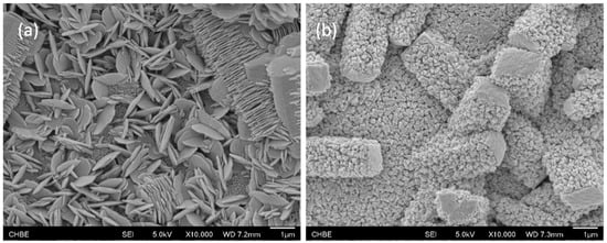 Figure 4 shows the surface morphology after the second growth phase for 50 h using different aluminum sources of (a) aluminum nitrate and (b) aluminum acetylacetonate. For both cases, large surface coverages are observed because a great number of MOF crystals are formed. The major difference between these two aluminum sources is the shape of the resultant MOF crystals. In the case of aluminum nitrate, flower-like crystals are obtained, where each crystal piece is like a petal of flower. In the case of aluminum acetylacetonate, ordered nanocrystals are formed, which cover the entire substrate surface. These morphological differences are attributed to the different activity of the two aluminum sources [,]. Since aluminum nitrate has a larger solubility in the reaction solvent of water, more free Al ions are available in the solution. Therefore, the MOF crystals grow rapidly and radically towards the bulk solution. On the other hand, because aluminum acetylacetonate has lower solubility in water, small MOF crystals are formed due to limited free Al ions around the crystal seeds because of concentration polarization.