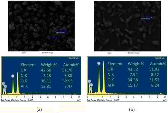 Energy dispersive spectrometry (EDX) element distributions on the crystals grown from (a) aluminum nitrate and (b) aluminum acetylacetonate sources.