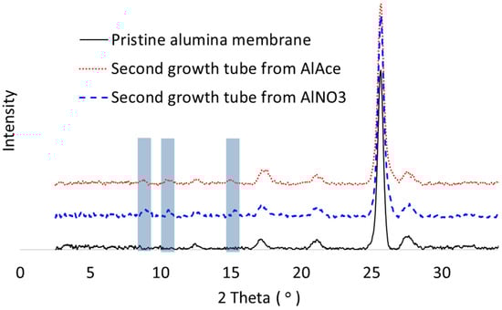 The XRD (X-ray diffraction) patterns of pristine alumina membrane, second growth tube from aluminum acetylacetonate and second growth tube from aluminum nitride.