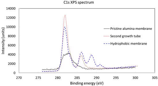 The C1s X-ray photoelectron spectroscopy (XPS) spectra of the pristine alumina membrane, second growth tube from aluminum acetylacetonate and hydrophobic membrane.