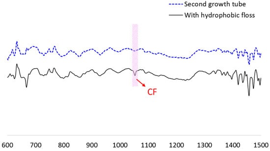 Since no differences can be observed by SEM after perfluoro molecule growth, Figure 8 compares the C1s XPS spectra among the pristine alumina membrane, the second growth tube and the final hydrophobic membrane. The pristine membrane displays one peak, which is the reference condition. With the growth of MOF crystals, one additional C1 peak appears at higher binding energy due to the new carbon environment introduced from 2-amino terephthalic acid. Then, two new C1 peaks appear at around 289 and 291 eV binding energy after the growth of hydrophobic floss. These two high binding energy are the characteristics of carbon atoms that have double bonds or bonds with halogen elements [,]. Therefore, they can be assigned to CF2 and CF3 in the perfluoro molecule, respectively. In summary, this XPS spectrum signifies the successful grafting of the perfluoro molecules on the MOF-functionalized membrane. In addition, FTIR measurements were also carried out to examine the chemical property changes in the second growth tube and the final hydrophobic membrane. As shown in Figure 9, the CF functional group can be distinguished from the FTIR spectra at the wavenumbers of 1050 cm−1 after the hydrophobic floss growth [,]. This further validates that the perfluoro molecules have been successfully added to the membrane surface.