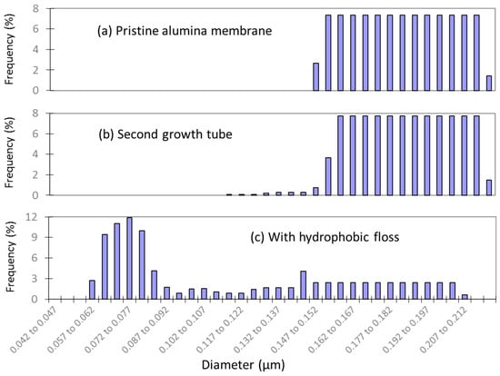 Pore size distributions of the three membranes: (a) pristine; (b) second growth tube from aluminum acetylacetonate and (c) with hydrophobic floss.